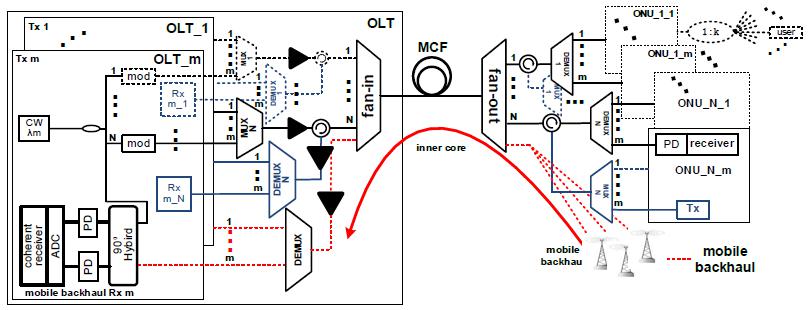 隨著云計算的風靡,互聯網巨頭規劃建設了越來越多的大型數據中心,多芯光纖具有非常大的潛能,發揮用武之地。隨著移動通信技術的發展,基于移動通信網絡的豐富應用帶動了移動數據業務的大幅度增長,為了在大幅度擴容時同時滿足綠色和低成本的運營要求,5G無線網絡的頻譜效率和能量效率都需要在4G標準上提高一個數量級。而未來5G通信中關鍵技術之一就是大規模陣列天線多輸入多輸出技術(Massive MIMO),假設陣列天線由128根天線組成,信號帶寬100MHz,采用16bits量化和8b/10b編碼,則其與基帶池鏈路的數字復合速率將高達786Gbps。因此基于光纖的光載無線(RoF)傳輸技術將是未來移動通信傳輸的關鍵技術。目前國際上關于5G關鍵技術的研發開展的如火如荼,而空分復用技術將會豐富其技術方案的選擇,甚至有潛力成為其中的關鍵技術。