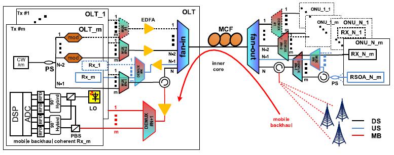 首先,針對當前空分復用大容量接入網距離短、速率低、調制格式低級,普遍采用時分復用的研究現狀,搭建了多芯光纖傳輸平臺,由光頻梳作為下行光源,調制高階格式信號,經過6個外層芯傳輸到ONU端;在ONU端,上行采用可調激光器作為光源,調制OOK信號,同樣經過6個外層芯傳輸。為了降低成本,對上下行信號采用直調直檢技術。為了兼容移動回傳業務,在中間芯傳輸移動回傳信號,并在OLT端進行相干接收,從而實現兼容移動業務的新型大容量波分/空分接入網架構(如圖5所示)。初步實現在58公里多芯光纖下行傳輸容量300Gb/s,支持60個用戶,每個用戶5Gb/s。實驗結果如圖6、圖7所示。