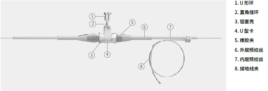 雙懸垂線夾采用雙懸掛頭設計方案,包括內外層預絞絲、兩套懸掛頭、接地線夾和配套連接件等。雙懸垂線