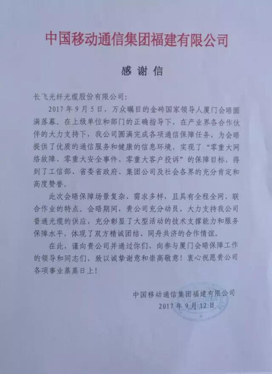 近日,萬眾矚目的金磚國家領(lǐng)導人廈門會晤圓滿落幕,長飛光纖光纜股份有限公司(以下簡稱“長飛公司”,股票代碼:6869.HK)全程參與了該會晤的通信保障工作,并且作為本次會晤通信保障工作中光纜供貨量最大的供應商,榮獲中國移動通信集團福建有限公司授予的“優(yōu)秀合作伙伴”。